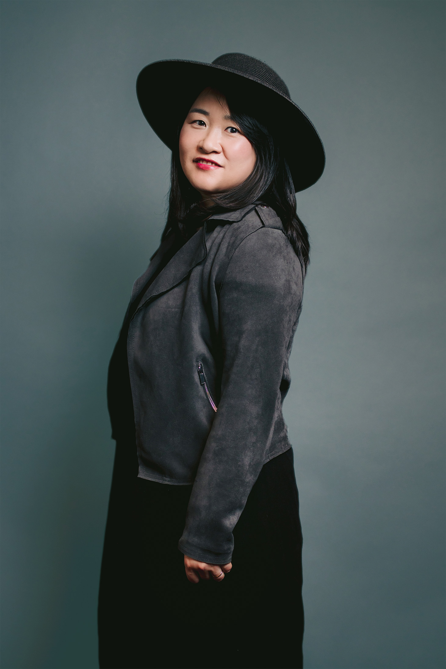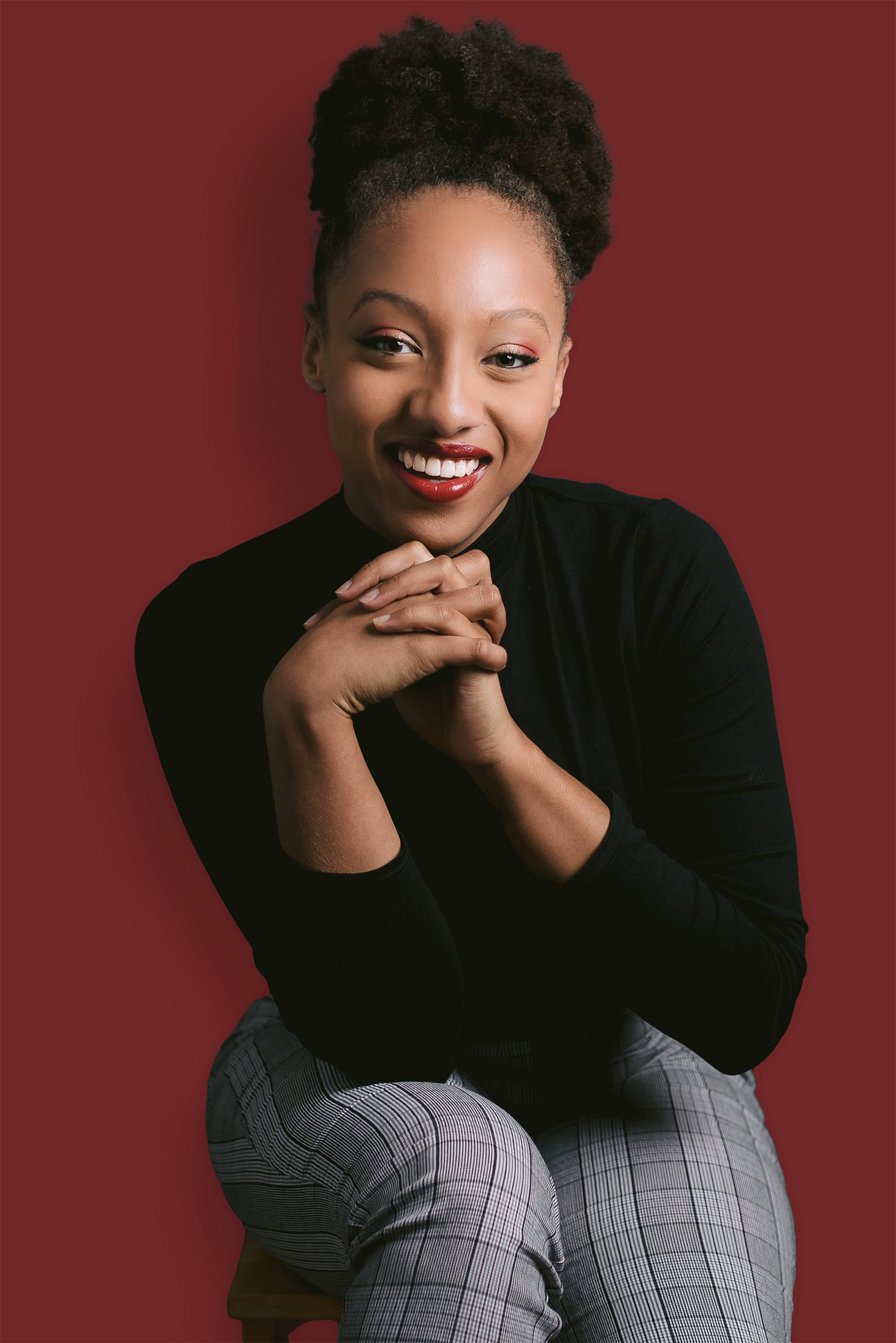 Portrait of a cheerful businesswoman on a pink backdrop, highlighting her personality during a professional photo session.