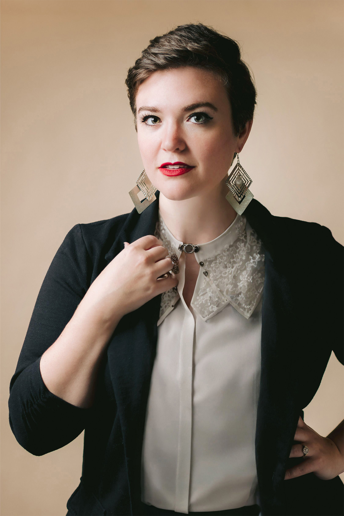 a female professional in a black blazer and white shirt poses for a professional headshot, showcasing her polished and confident look.